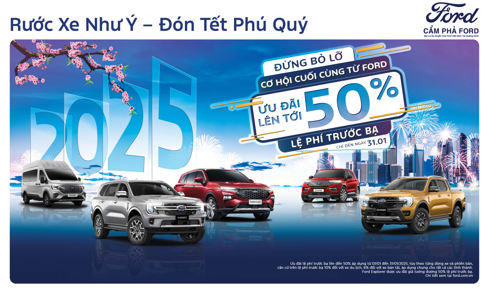 Cẩm Phả Ford hân hạnh triển khai chương trình ưu đãi lớn nhất tháng 1/2025 nhân dịp chào đón Tết Nguyên Đán với thông điệp: “Rước Xe Như Ý - Đón Tết Phú Quý.” Đây là cơ hội để Quý khách hàng sở hữu những mẫu xe Ford chất lượng với ưu đãi hấp dẫn nhất trong năm.