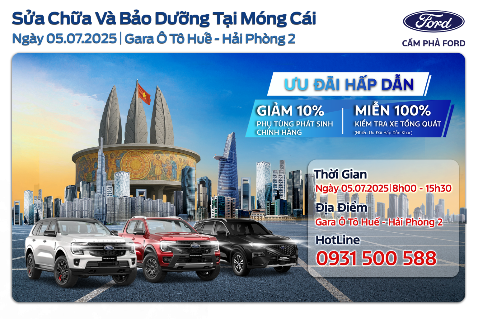 Với mong muốn mang dịch vụ chính hãng đến gần hơn với khách hàng khu vực biên giới, Cẩm Phả Ford tiếp tục hành trình bảo dưỡng & sửa chữa lưu động tại TP Móng Cái. Vào ngày 05/07/2025, khách hàng sở hữu xe Ford sẽ được chăm sóc toàn diện mà không cần phải di chuyển xa.