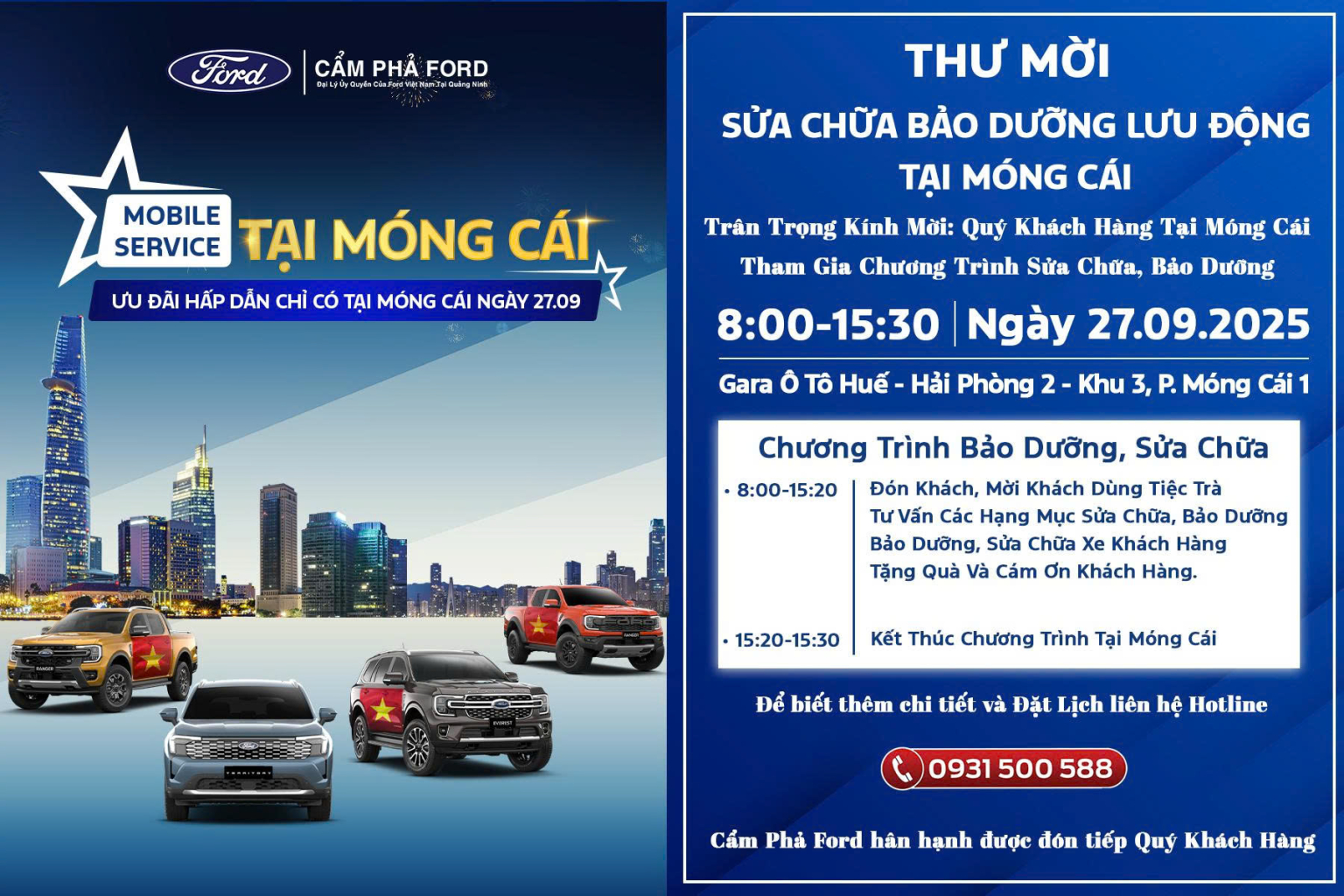 Đây là cơ hội không thể bỏ lỡ để chăm sóc “xế yêu” của bạn an toàn, tiết kiệm và hiệu quả. Hãy liên hệ ngay với Cẩm Phả Ford để được tư vấn và đặt lịch tham gia chương trình bảo dưỡng sửa chữa lưu động tại Móng Cái ngày 27/09/2025.