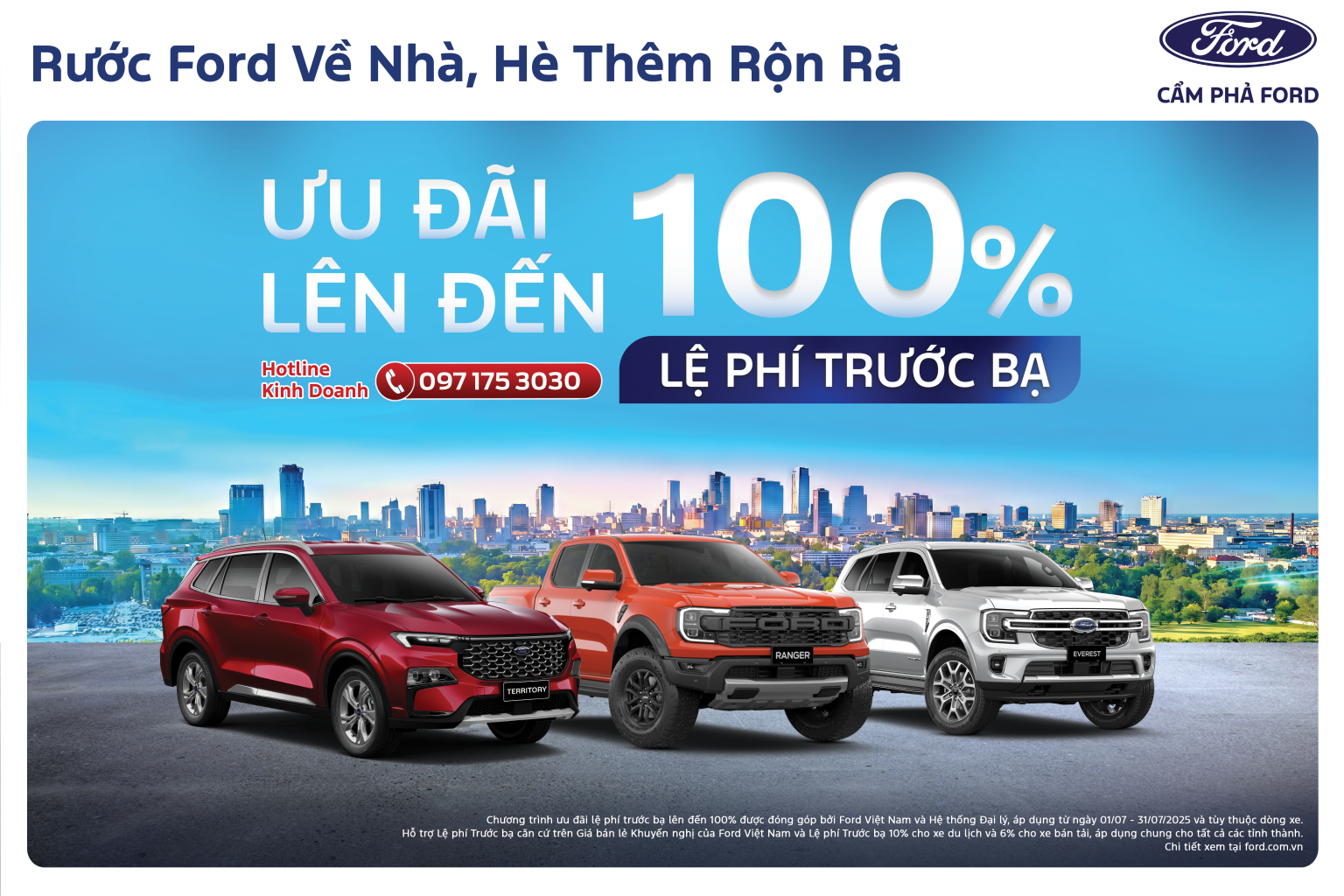 Từ ngày 01/07 đến 31/07/2025, Cẩm Phả Ford triển khai chương trình “Rước Ford Về Nhà – Hè Rộn Ràng Với Ưu Đãi Trước Bạ” dành riêng cho khách hàng ký hợp đồng mua xe trong thời gian diễn ra chương trình.