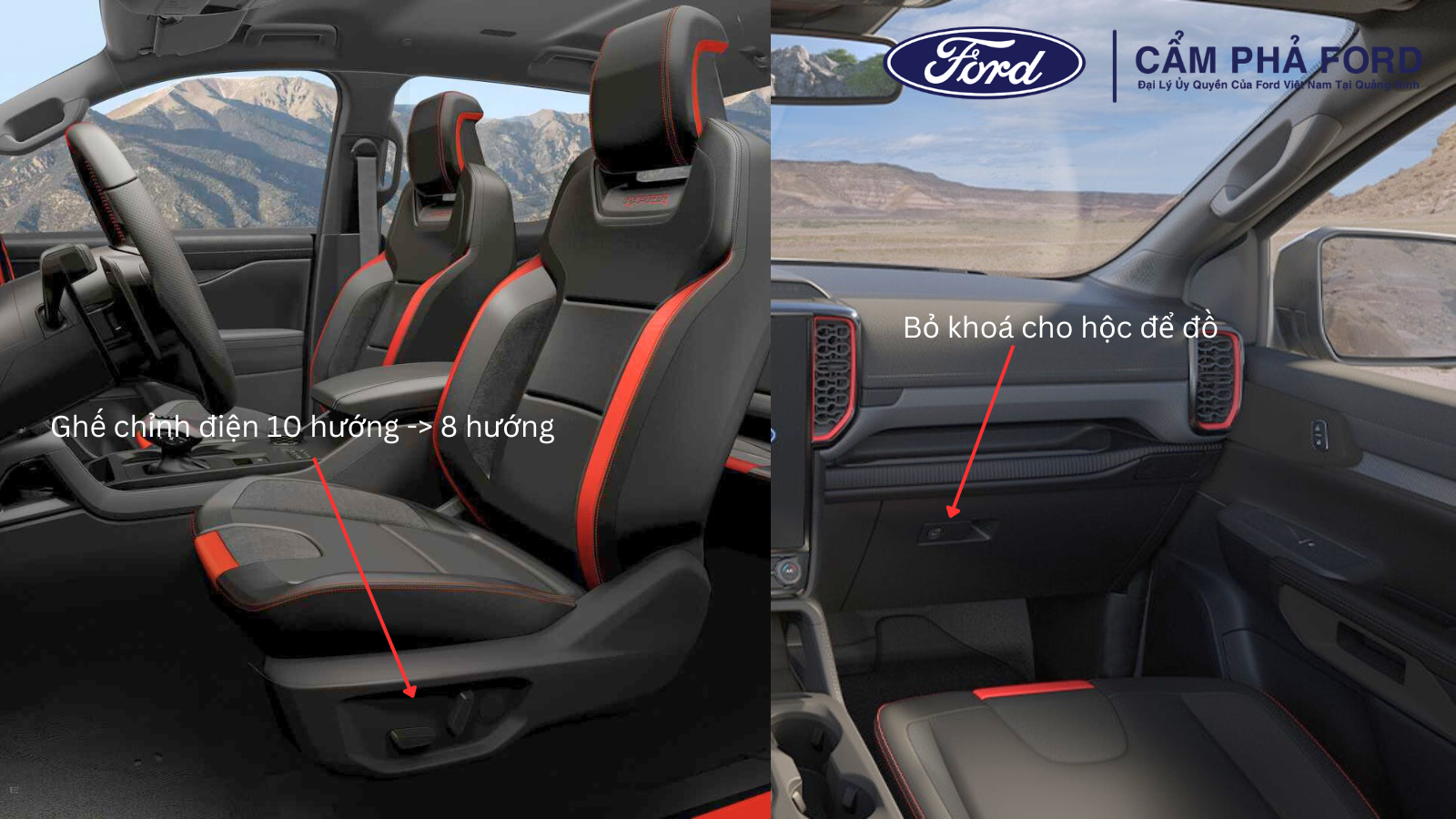 Ghế lái chỉnh điện ở bản Ford Ranger Raptor 2025 sẽ xuống 8 hướng, và bỏ khoá cho hộc để đồ