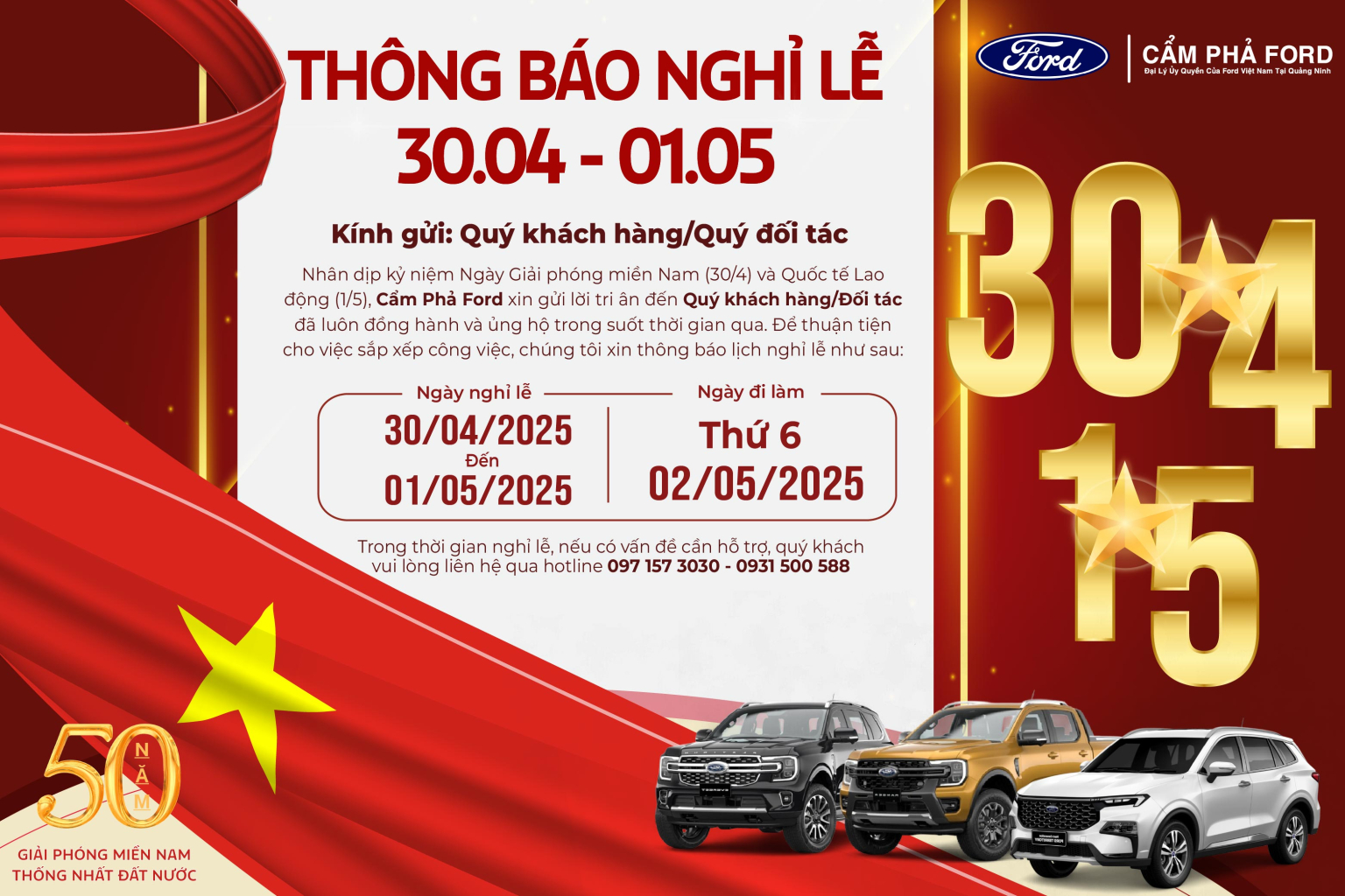 Cẩm Phả Ford xin trân trọng thông báo lịch nghỉ lễ 30/4 - 01/05 như sau:
