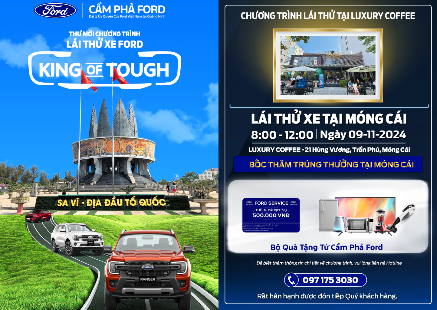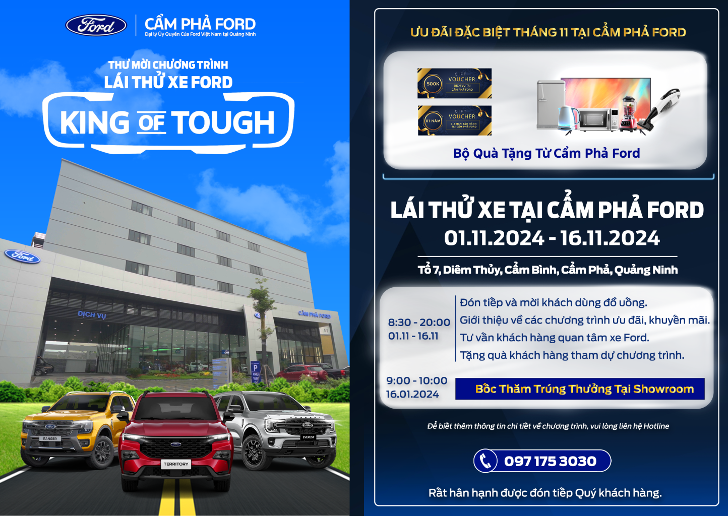 Trải nghiệm đỉnh cao tại Ford Roadshow – King of Tough từ Cẩm Phả Ford! Lái thử các mẫu xe đẳng cấp, nhận quà tặng và tham gia rút thăm trúng thưởng hấp dẫn.