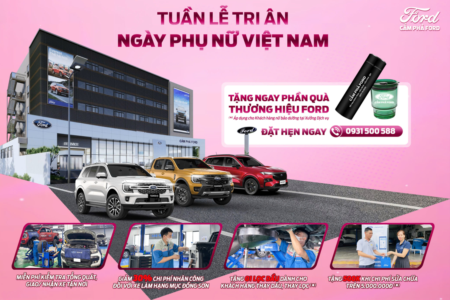 Từ ngày 14/10/2024 đến 20/10/2024, quý khách hàng nữ đến làm dịch vụ với Cẩm Phả Ford sẽ nhận ngay phần quà độc đáo, mang dấu ấn thương hiệu Ford, như một lời tri ân sâu sắc từ Cẩm Phả Ford. Bên cạnh đó, còn có hàng loạt ưu đãi hấp dẫn khác dành riêng cho phái đẹp, bao gồm: